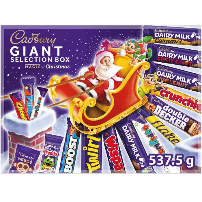 FULL SIZE CHOCOLATE BARS :Â Unwrap joy with the mega Cadbury Giant Selection Box, jam packed with over half kilogram of chocolate bars. All your classic Dairy Milk favourites and perfect for gifting, indulging or sharing with loved ones this festive season!
